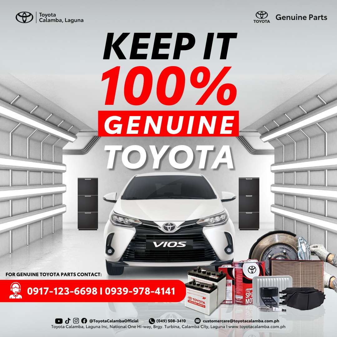 Your Toyota car was built with precision, and only genuine Toyota parts can maintain its peak performance. Toyota Genuine Parts are designed to fit perfectly, last longer, and ensure safety on the road. Don't compromise, always choose authenticity and reliability!For more details, check our Facebook page, Toyota Calamba or click this link https://www.facebook.com/share/p/1HujLXgCed/ .