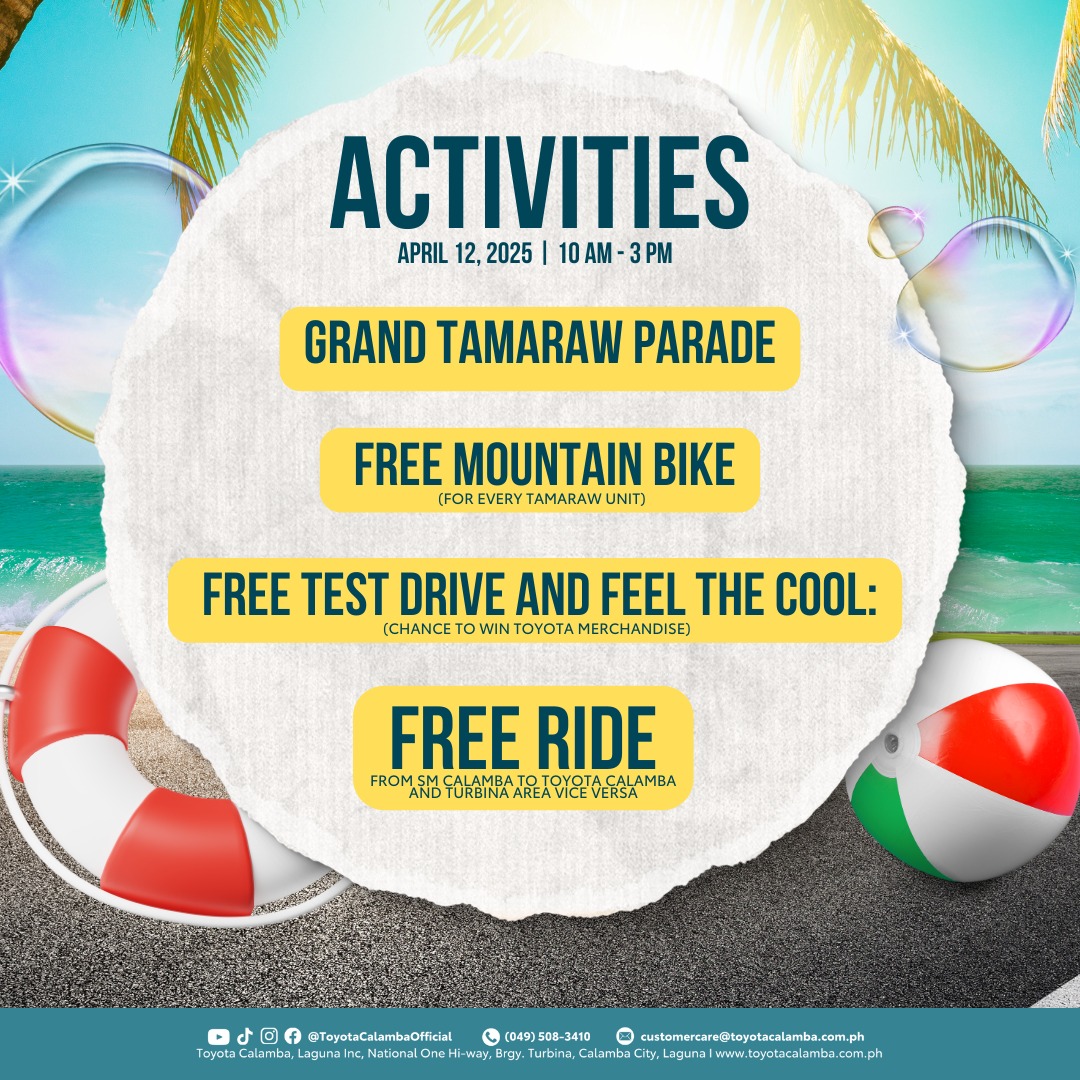 Painit nang painit habang papalapit ang ating ๐ง๐ฎ๐บ๐ฎ๐ฟ๐ฎ๐ ๐๐ฎ ๐ง๐ฎ๐ด-๐ฎ๐ฟ๐ฎ๐: ๐ง๐ผ๐๐ผ๐๐ฎ ๐๐ฎ๐น๐ฎ๐บ๐ฏ๐ฎ ๐ฆ๐๐บ๐บ๐ฒ๐ฟ ๐๐ถ๐ฐ๐ธ ๐ข๐ณ๐ณ! Ngayong Sabado na to guys, April 12 mula 10am to 3pm, kaya wag na wag ninyong palalampasin! May libreng sakay tayo for SM Calamba papuntang Toyota Calamba at Turbina, free test drives, and more! G? G na yan! Kitakits!